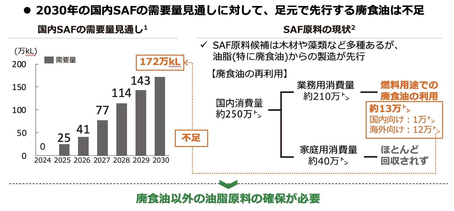 当社は2022年にNEDOの「バイオジェット燃料生産技術開発事業/実証を通じたサプライチェーンモデルの構築」の助成先として採択されたことから、国産SAFの研究開発を進めてきました。国産SAFの製造に目を向けると、国土交通省が2030年頃には172万kLのSAF需要を想定しています※1。現在、国内の研究開発で先行しているのが廃食油。廃食油とは、天ぷらなど調理に使用した後の使えなくなった油のことです。国内の廃食油は、食用油全体の消費量が約250万トンのうち燃料として再利用されているのはわずか13万トン(約14万kL)ほどで、目標とする172万kLには大きく不足しているのが実情です※2。