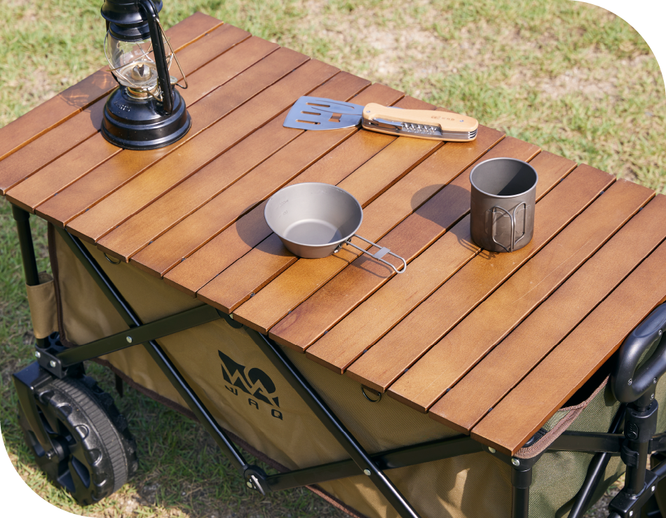 傾斜がなく、フラットなフィールドで気軽にキャンプを楽しむ方にはアウトドアワゴンをテーブル活用するもおすすめ。 キャンプの荷物を運ぶのに便利なアウトドアワゴンは、専用の天板や、100均やホームセンターにあるすのこを取り付けることで、 瞬時にテーブルに大変身する優れもの。高さも絶妙で、ロースタイルとハイスタイルどちらとも相性が抜群。 キッチンテーブルとして使っている間は、キャンプ中に使用しないアイテムを収納する収納庫としても活躍。 カスタマイズ気分も味わえて、賢くキャンプを楽しみたい方にピッタリです。