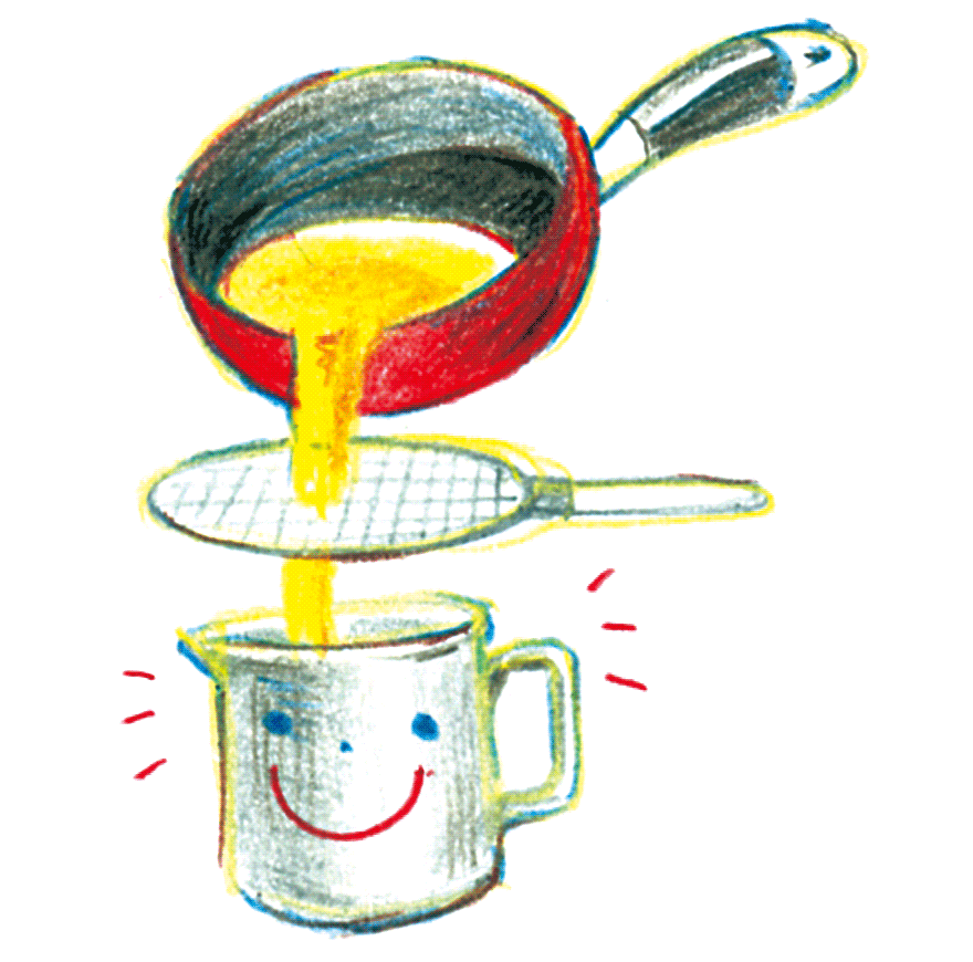 - 揚げ油が完全に冷える前に油こしでろ過し、冷ましたあと、保存容器に入れます。油こし紙を使うと、細かい揚げかすもきれいに取り除くことができます。このとき、火傷には十分注意してください。汚れが少ない場合は、揚げかすが沈んだあと、上澄みだけを保存容器に移し替えてもかまいません。