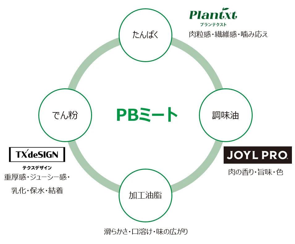 例えば、テクスチャー素材(スターチ)やフレーバーオイル「JOYL PRO®」(ジェイオイル プロ)、植物性タンパク素材を含めた当社製品の組み合わせにより、植物性たんぱくだけでは成し得ないジューシー感や肉粒感の食感の付与、植物由来原料の異風味のマスキングを可能にしました。